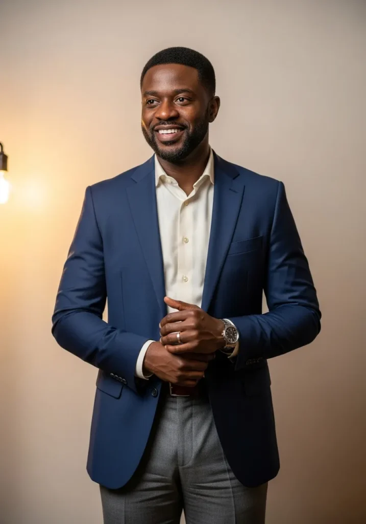 This look features a navy blazer worn over a light shirt and styled with black trousers. The fit is sharp and the fabrics look structured yet comfortable. Dark shoes keep the look cohesive and refined.