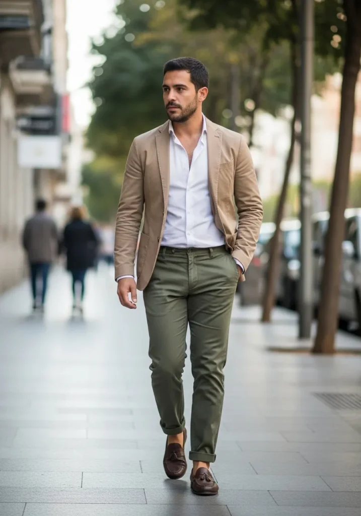 This outfit pairs a beige blazer with a white shirt and olive green trousers. Brown leather shoes complete the look and add warmth. The color palette feels earthy and relaxed while still looking polished.