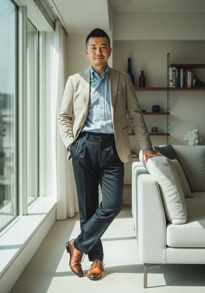 This outfit mixes a soft beige blazer with a light blue shirt and dark tailored trousers. The blazer has a relaxed structure which gives it an easygoing feel. Brown leather shoes add warmth and make the look feel intentional and polished. The whole outfit feels bright and approachable.