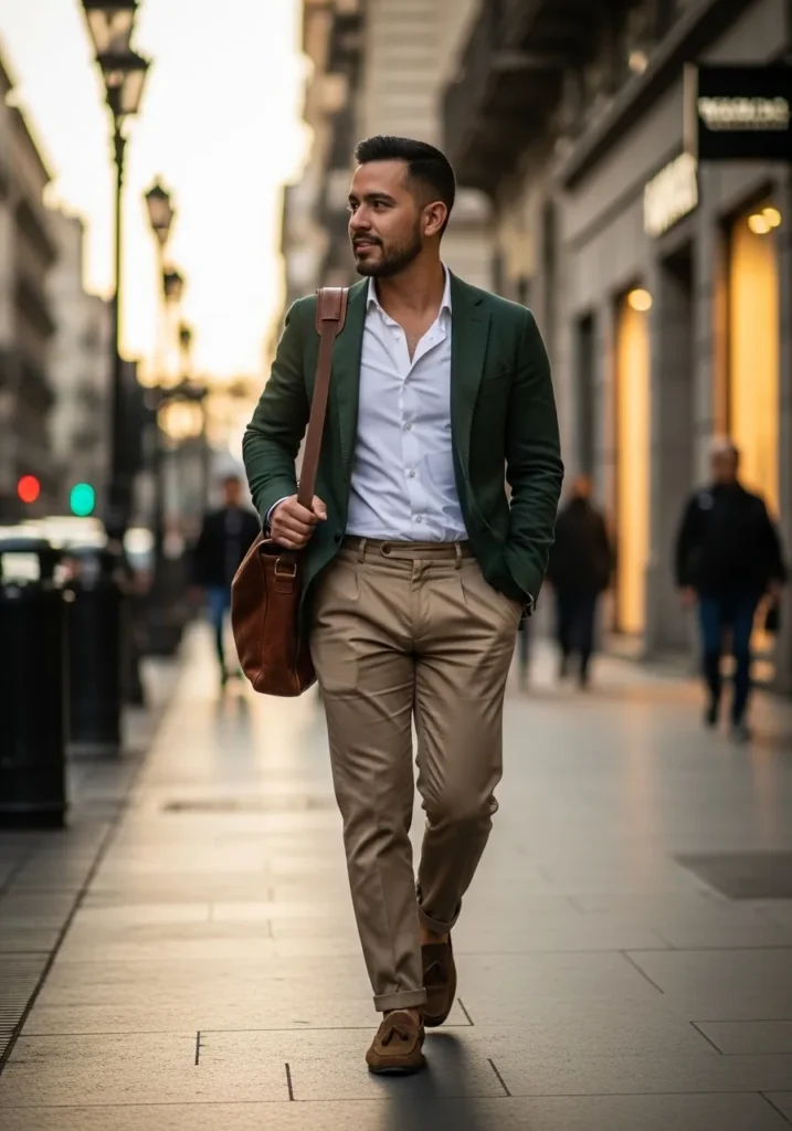 Here we see an olive green blazer layered over a white shirt and paired with tan trousers. The earthy tones work beautifully together and feel grounded and stylish. Brown shoes and a casual bag complete the look and give it a city ready finish.