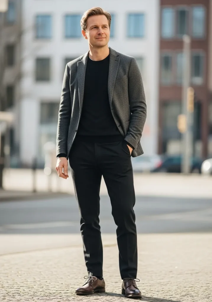 This outfit features a dark blazer layered over a black polo shirt and grey trousers. Brown shoes add contrast and keep the look grounded. The combination feels modern and slightly sporty while staying professional.