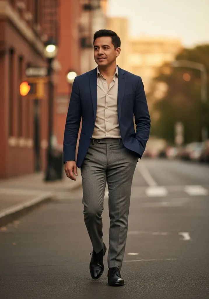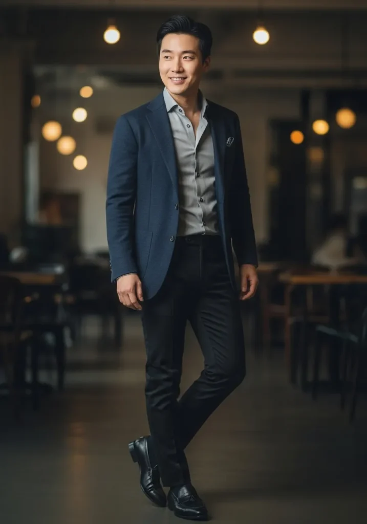Here we see a navy blazer styled with a light shirt and slim grey trousers. Black leather shoes keep the look sharp and professional. The fit is streamlined and the color combination feels classic with a modern edge.