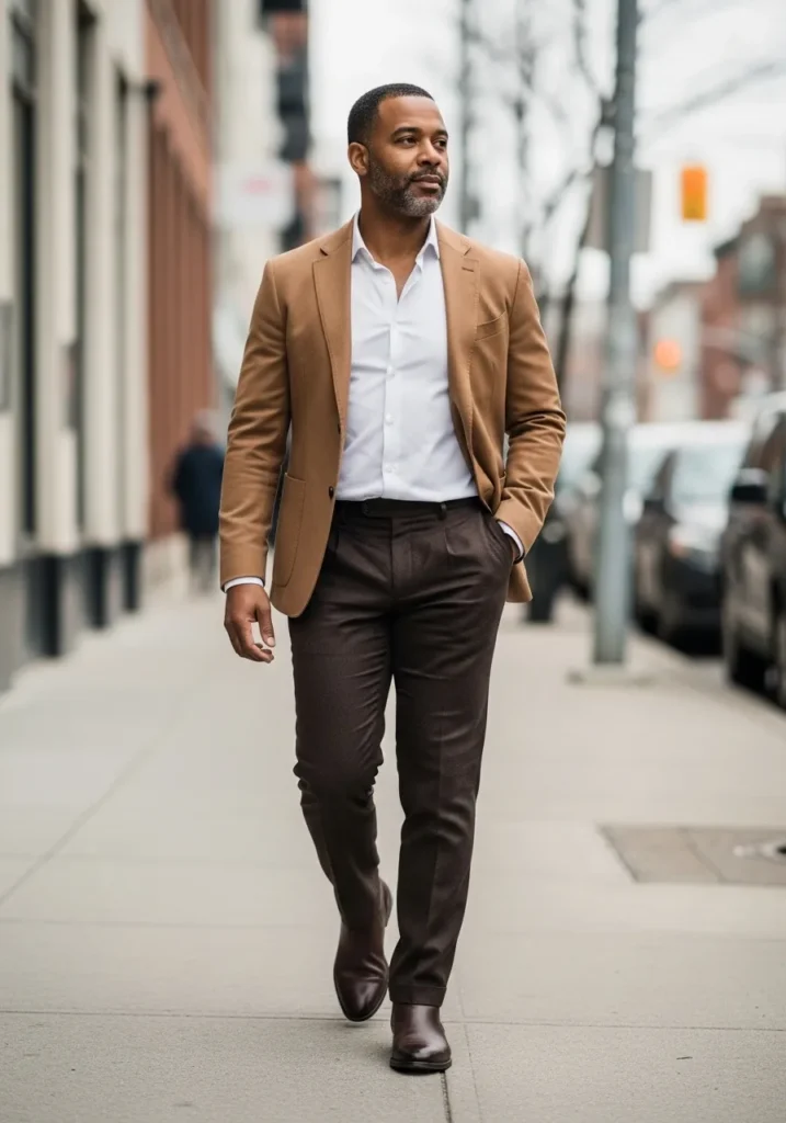 This outfit combines a warm camel blazer with a white shirt and deep brown trousers. The color palette feels rich and well balanced. Dark brown shoes tie everything together and add a polished finish.
