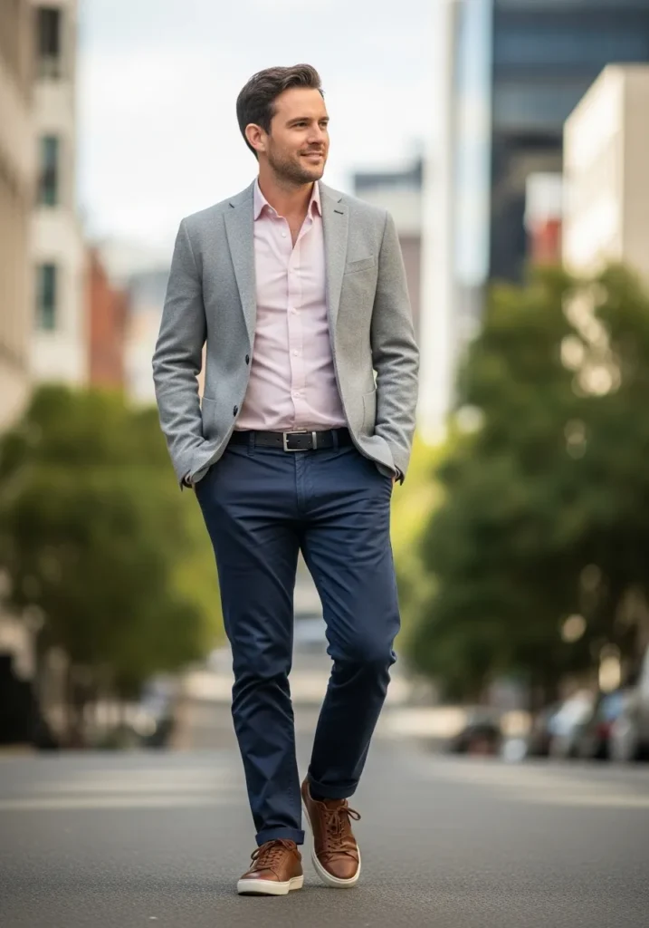 This outfit pairs a light grey blazer with a soft pink button down and dark blue tailored trousers. The fit is clean and modern with brown suede shoes adding a relaxed finish. The colors feel fresh and balanced and the overall look feels polished without looking stiff.