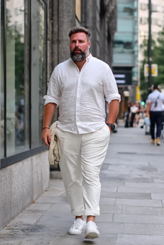 I totally think this outfit is a huge win for looking put-together and relaxed all at once. The key here is the linen shirt because the flowy fabric keeps things light, while the button-down style still feels polished and refined. Pairing the shirt with light-colored shorts is a genius move for summer, and the rich brown loafers instantly elevate the whole thing far beyond simple flip-flops. It just screams confidence and good taste without feeling fussy or overdressed for a sunny day.