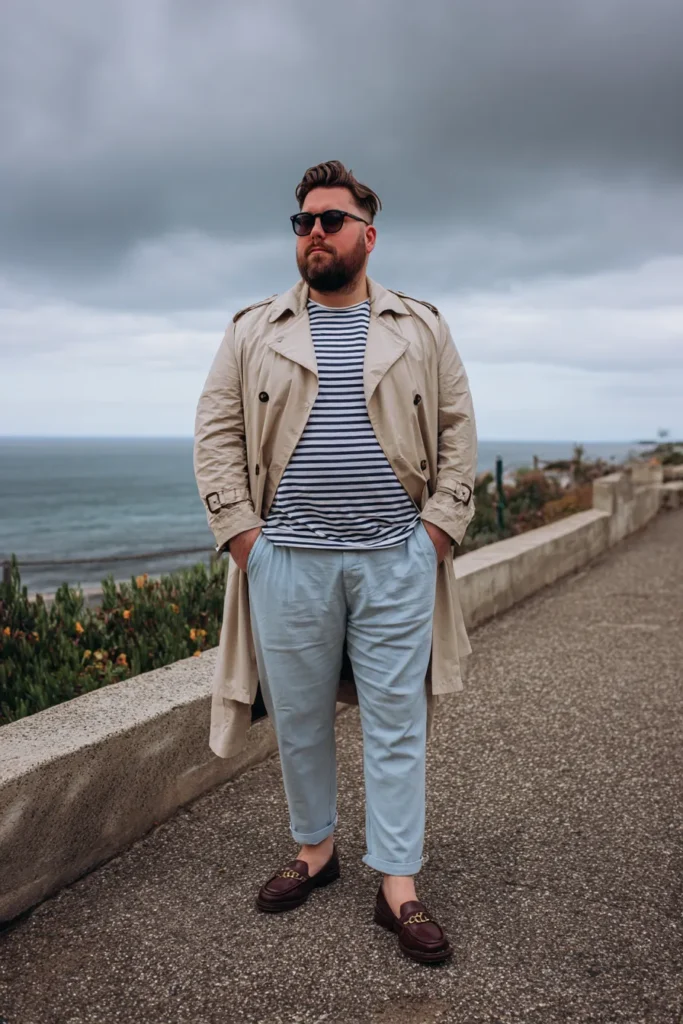 This is an absolutely gorgeous, effortlessly cool look that feels like a chic weekend getaway by the sea. He’s layered a classic beige or light tan trench coat over a staple navy and white Breton striped t-shirt, giving serious nautical vibes. The bottom half features relaxed-fit trousers in a soft, light blue color, which are cuffed for a relaxed feel. Finishing the outfit are a pair of rich brown leather loafers, adding a touch of sophisticated polish that contrasts perfectly with the laid-back trousers.
