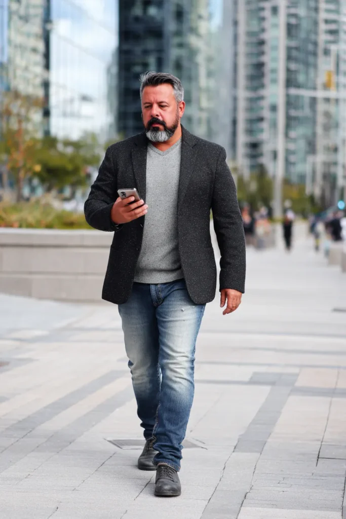 This is a fantastic example of a smart-casual look that balances a refined blazer with the rugged appeal of jeans for a confident daytime style. He’s layered a dark gray or charcoal blazer with a light speckle pattern over a soft light gray V-neck sweater, which looks instantly elevated. The sharp top half is contrasted beautifully with a pair of light wash, slightly distressed blue jeans. The whole outfit is grounded with a pair of dark gray lace-up casual boots, making it a perfect mix of polished and relaxed.