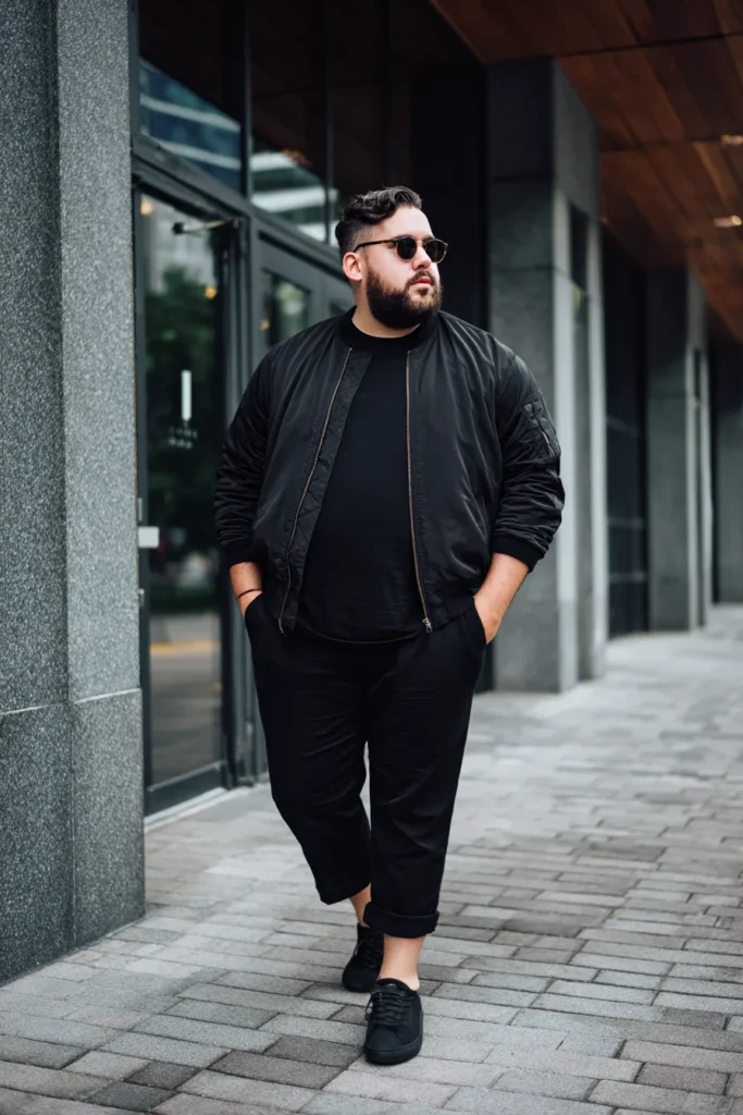 This is an incredibly sleek and modern outfit that nails the cool, monochromatic city aesthetic. He is rocking an all-black ensemble featuring a stylish, slightly shiny black bomber jacket worn over a simple black crew neck t-shirt. On the bottom, he’s wearing comfortable black trousers that are cuffed to expose the ankle, adding a contemporary touch. The look is grounded with black sneakers and finished off perfectly with dark sunglasses, giving off serious effortless confidence and street-style chic.