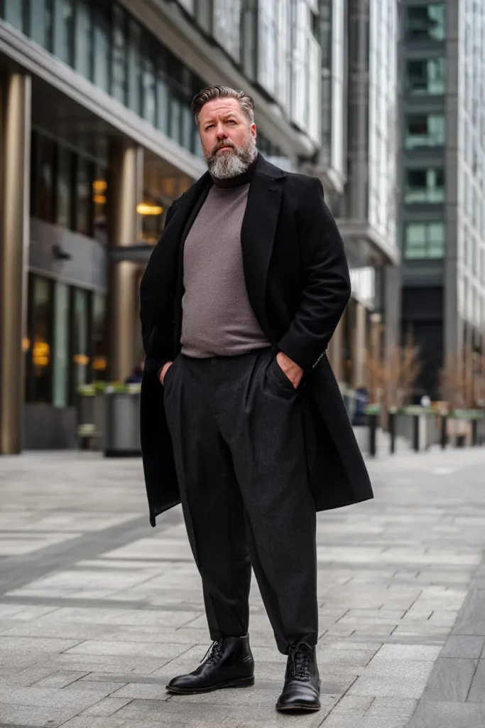 This is a powerful, polished look that screams modern urban sophistication, perfect for a cold day in the city. The foundation is a gorgeous black wool overcoat with a slightly oversized, structured fit that hangs beautifully. Underneath, he’s wearing a high-neck or mock-neck sweater in a warm, taupe or mushroom grey color, which provides a lovely soft contrast to the black. The outfit is completed with dark, charcoal grey wide-leg trousers and sleek black lace-up boots, giving the whole ensemble a dramatic, tailored feel.