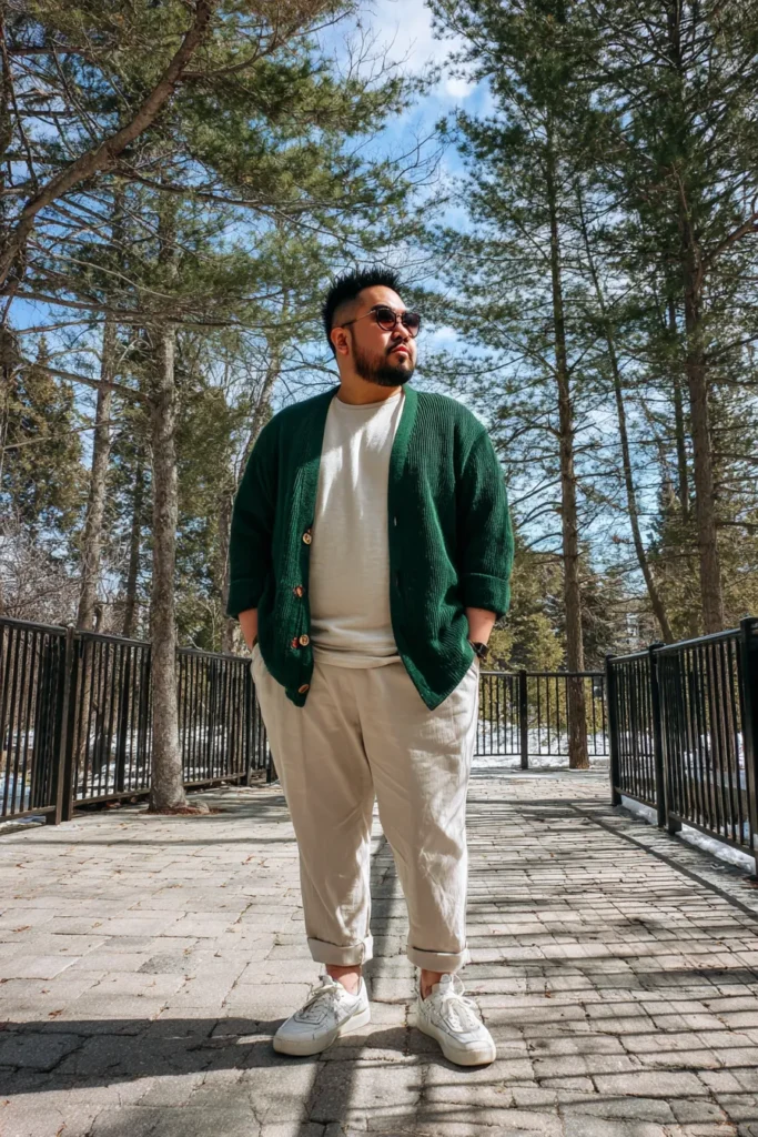 This outfit is the definition of casual comfort meeting stylish texture, perfect for a crisp day outdoors. He’s wearing an oversized, chunky knit cardigan in a rich forest green that adds a wonderful pop of color and coziness. Underneath, a simple, relaxed-fit crew neck t-shirt in cream or off-white provides a clean, neutral layer. The look is completed with relaxed, cuffed trousers in a light beige, and finished with clean white sneakers, giving the whole ensemble an effortlessly stylish and easygoing vibe.