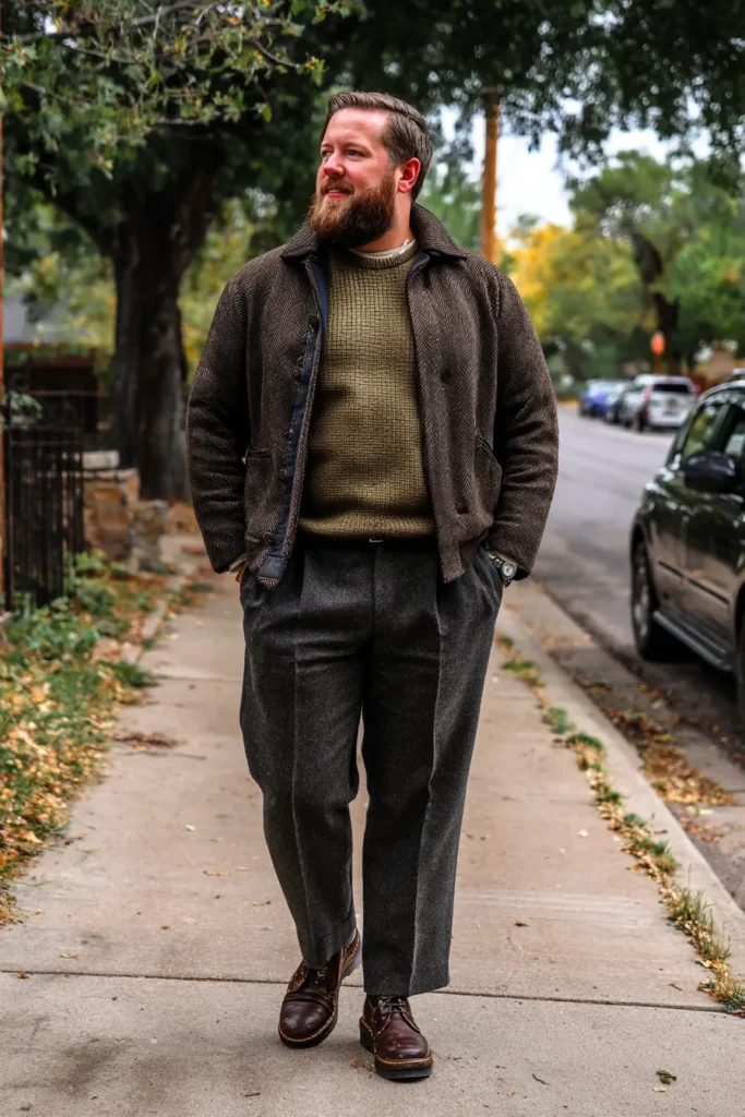 This look is a beautiful celebration of rich textures and warm, earthy tones, perfect for a cozy fall day out. He’s wearing a fantastic bomber-style jacket in a dark brown herringbone or tweed fabric, which adds an immediate sophisticated detail. Layered underneath is a chunky knit crew neck sweater in a muted olive or moss green color, creating a great focal point. The ensemble is grounded with wide, comfortable charcoal grey wool trousers and finished with dark brown leather lace-up boots, giving the entire outfit a rugged yet refined feel.