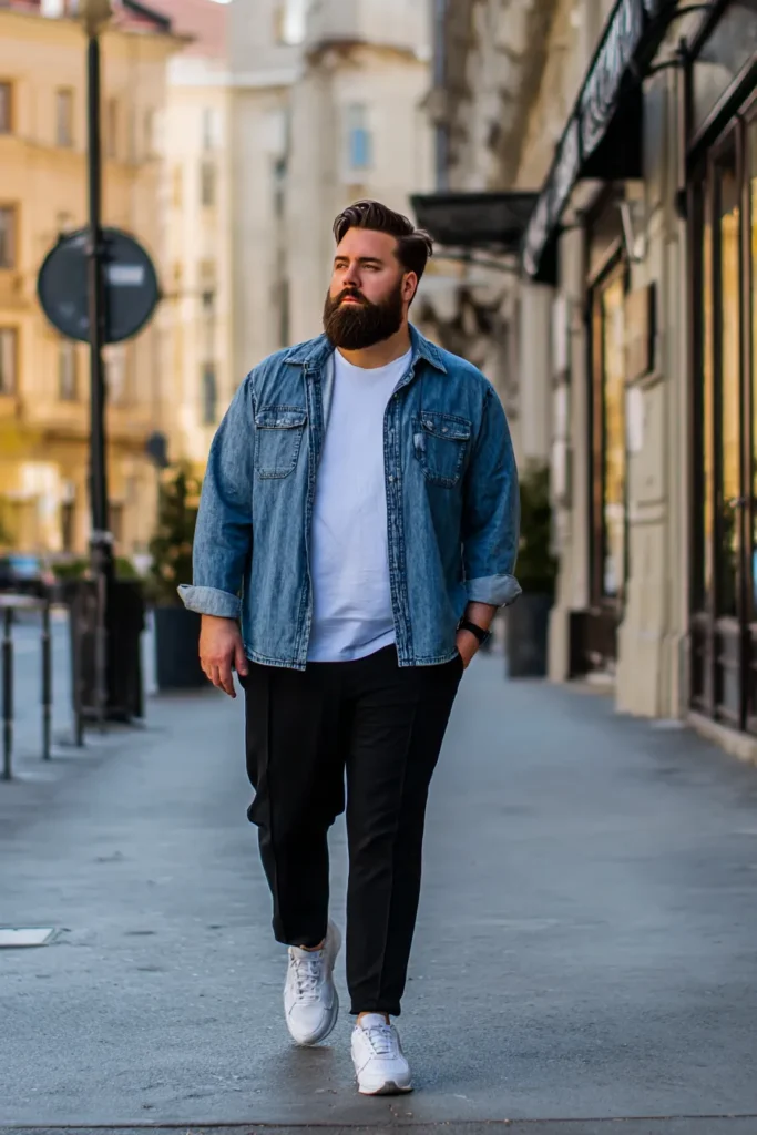 I think this outfit is incredibly flattering because the dark colors on top, especially that neat polo under the structured denim jacket, create a really streamlined and smart line. Pairing dark tops with lighter trousers is a simple but effective technique that always looks balanced and put-together. It’s an easy-to-wear combination that proves you can be comfortable and still look incredibly stylish and ready for anything the weekend throws at you.