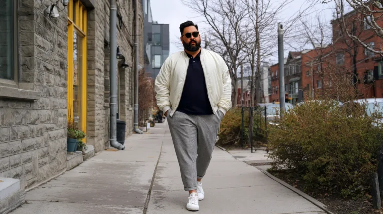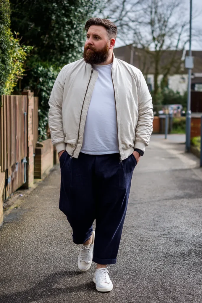 This outfit is the perfect example of comfortable street style meeting cool, modern design, definitely giving off weekend vibes. He’s wearing a fantastic lightweight bomber jacket in a crisp cream or off-white color layered over a simple white crew neck t-shirt. The bottom half features dramatically wide and slightly cropped navy blue trousers, a super trendy silhouette right now. The whole look is kept light and casual with a pair of matching white lace-up sneakers, making it a fresh and easy ensemble for a day out.