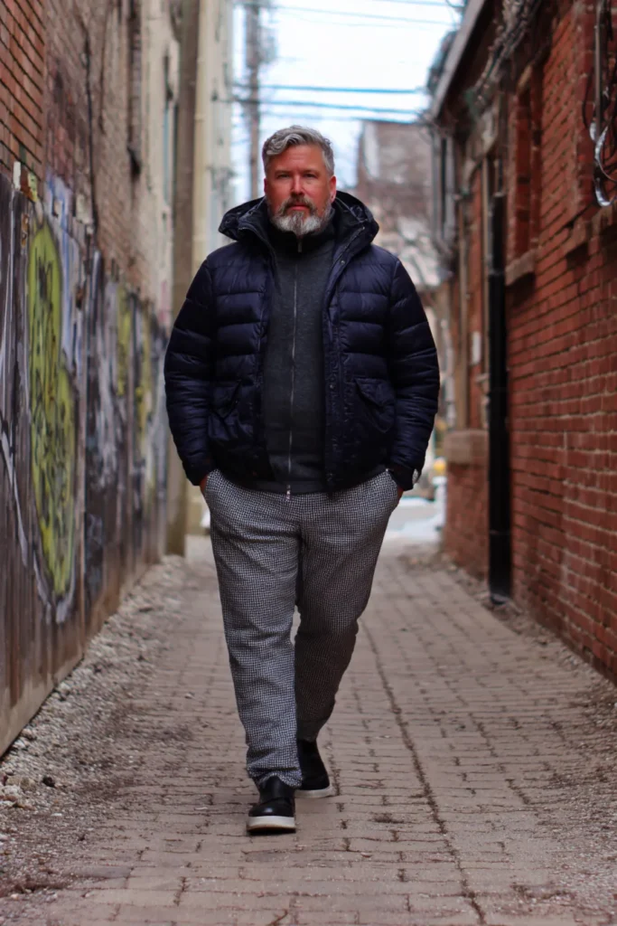 This look just screams sophisticated fall style with a gorgeous camel overcoat taking center stage! It’s paired with a sleek black turtleneck sweater underneath for a sharp monochromatic base. On the bottom, he’s wearing a pair of dark gray plaid trousers that are cuffed right above the ankle, finishing the whole ensemble with dark brown leather lace-up boots. The rich, warm tones of the coat and the boots create a lovely contrast with the dark core outfit, giving off a refined and classic vibe that’s perfect for a chilly day stroll.