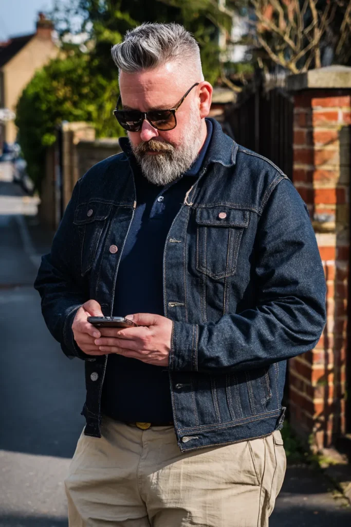 This is such a sharp, classic casual outfit that mixes two absolute wardrobe staples for a confident, effortless look. He’s wearing a beautifully fitted, dark indigo denim jacket, which gives the upper half a structured and rugged feel. Underneath, a dark navy polo shirt provides a clean and polished layer that pairs perfectly with the denim. The bottom half brightens things up with light khaki or beige trousers, creating a great contrast, and a pair of cool sunglasses finishes this perfect daytime ensemble.