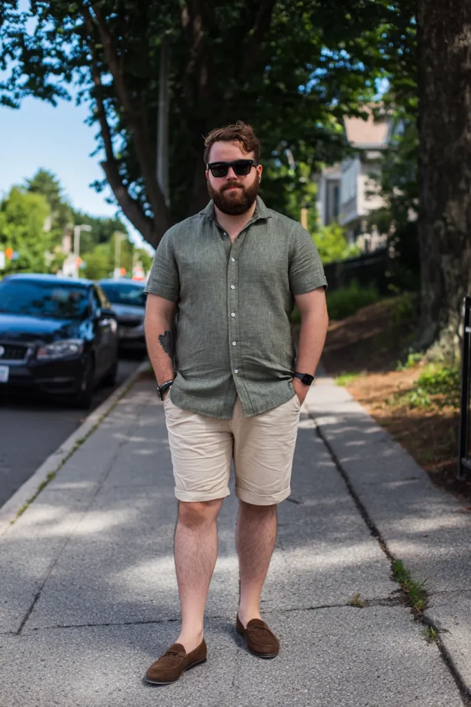 This outfit is pure summer perfection, giving off major relaxed sophistication for a warm afternoon. He’s wearing a short-sleeved button-down shirt in a beautiful muted sage green linen, which looks incredibly comfortable and breathable. The shirt is paired with light beige or khaki chino shorts that are tailored and hit just above the knee, keeping the look fresh and clean. The entire ensemble is instantly elevated by a pair of rich brown suede loafers worn without socks, adding that perfect touch of effortless style.
