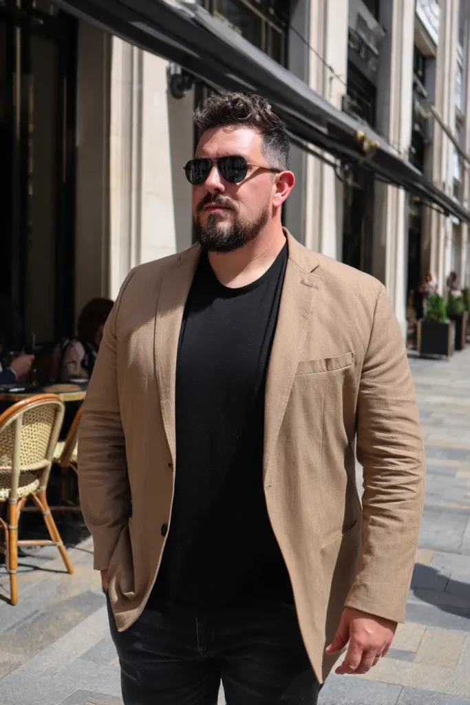 Talk about summer sophistication, this look is absolutely stunning and feels like a European holiday or a lovely outdoor lunch. He’s wearing a beautiful single-breasted blazer in a lightweight khaki or tan fabric, probably linen or a linen blend, which gives it that relaxed but structured feel. The blazer is effortlessly layered over a simple, fitted black crew neck t-shirt, which keeps the look dark and clean underneath. Paired with dark trousers, possibly black or charcoal jeans, and cool dark sunglasses, this outfit is polished and incredibly masculine.