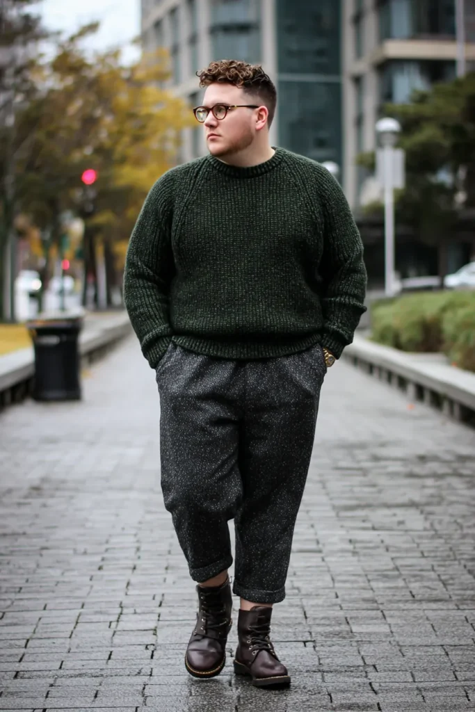 This outfit is the perfect picture of cozy, handsome fall style with a great mix of textures for visual interest. He’s wearing a thick, chunky crew neck sweater in a deep forest green color that looks incredibly warm and inviting. This is paired with dark charcoal tweed or speckled trousers that are slightly cropped and cuffed at the ankle, providing a sophisticated, slightly vintage feel. Dark brown lace-up boots and stylish glasses finish the look, making it a wonderful smart-casual ensemble for colder weather.
