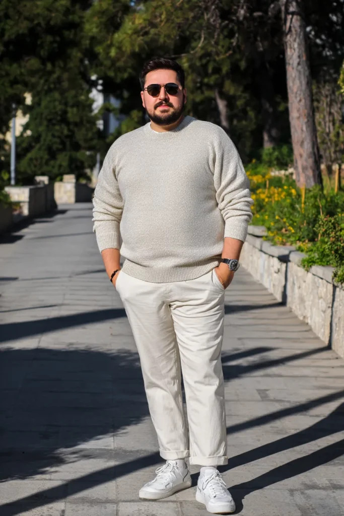 This look is absolutely gorgeous and proves that light colors in the winter are incredibly chic and totally elevated. He’s rocking a beautiful monochromatic outfit built around soft, creamy whites and beige tones. The centerpiece is a textured, chunky knit crew neck sweater in an off-white or oatmeal color that looks perfectly cozy. This is paired with matching light beige or off-white chinos, which are slightly relaxed and cuffed above the ankle. Clean white sneakers complete the look, making it fresh and stylish, perfect for a sunny day.
