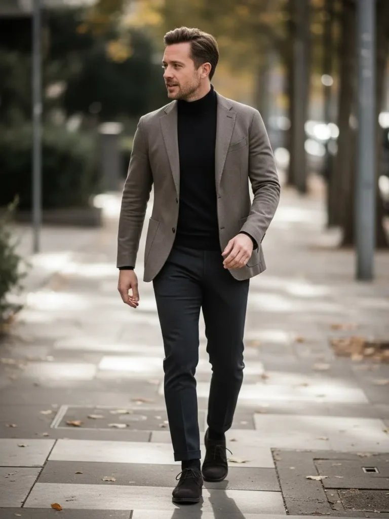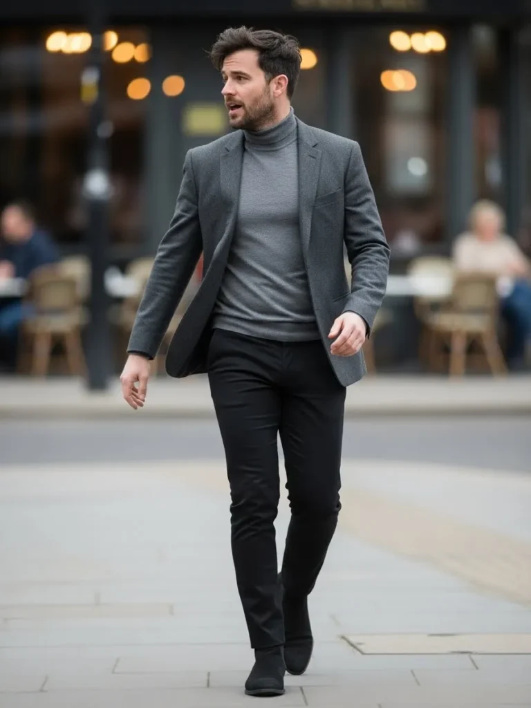 This look pairs a charcoal tailored blazer with a soft gray knit top and slim black trousers, finished with clean dark shoes. The fabrics feel smooth and structured, but not stiff, and the darker palette gives the outfit a sharp autumn mood that works perfectly for city strolls or casual meetings.