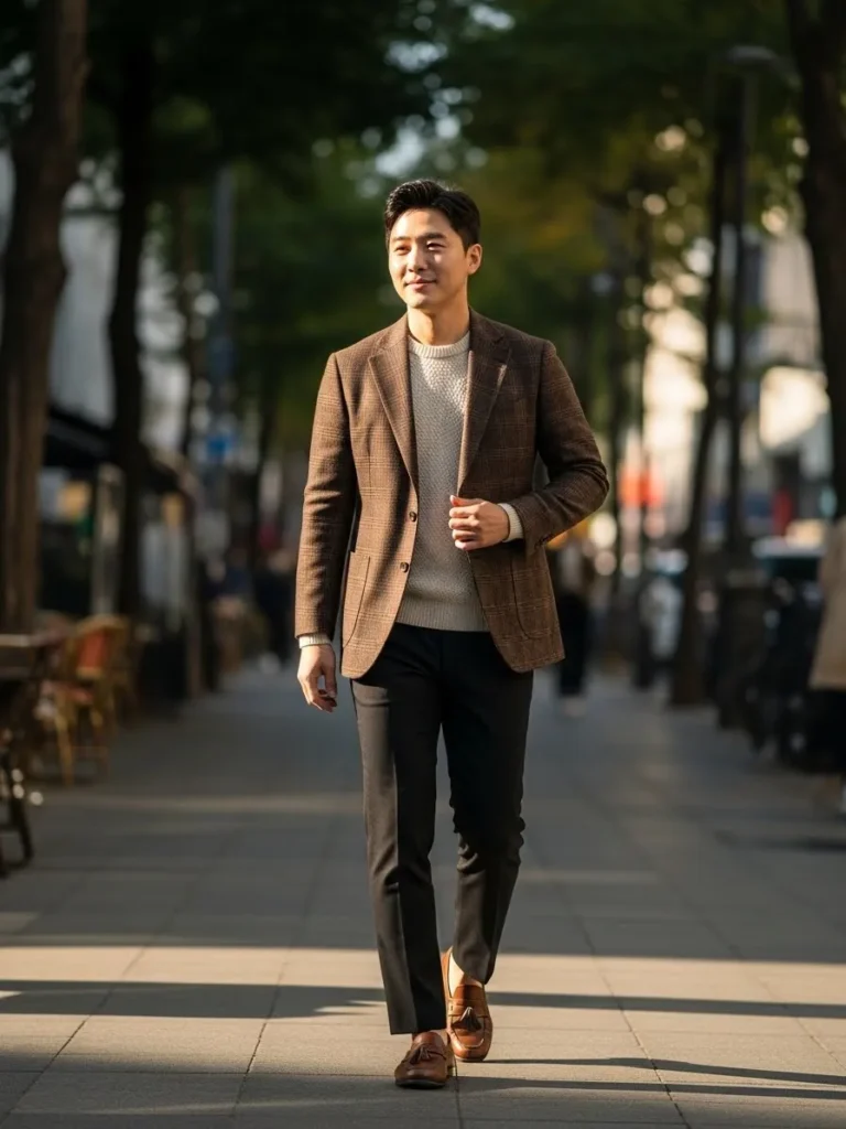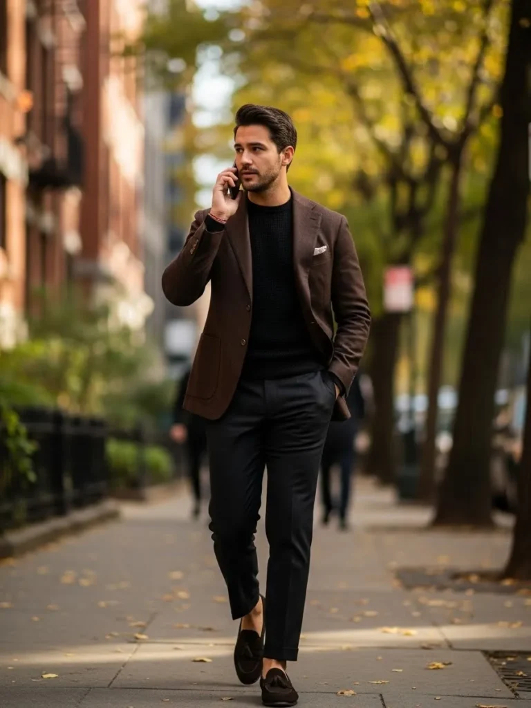 Here we see a brown blazer styled with a dark knit top and slim black trousers, finished with polished shoes. The textures feel soft and natural, giving the outfit an easy semi formal vibe that still looks intentional.