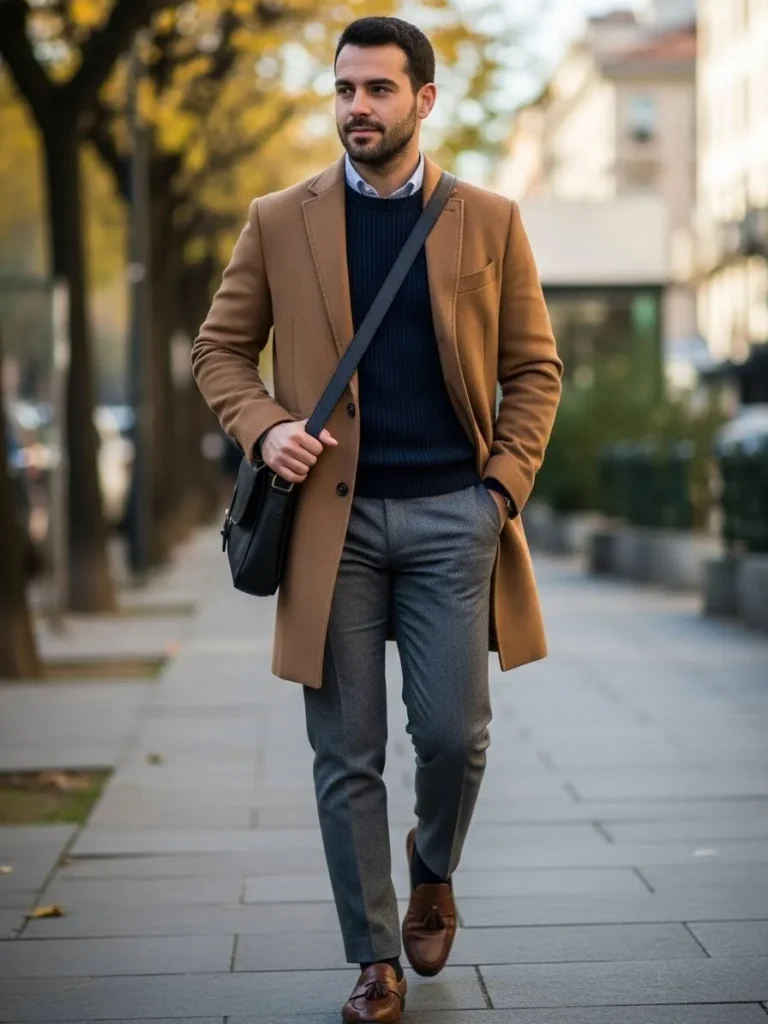 A camel coat is layered over a navy top and gray trousers, finished with classic brown shoes. The longer coat adds structure while the softer colors keep the outfit balanced and seasonal.