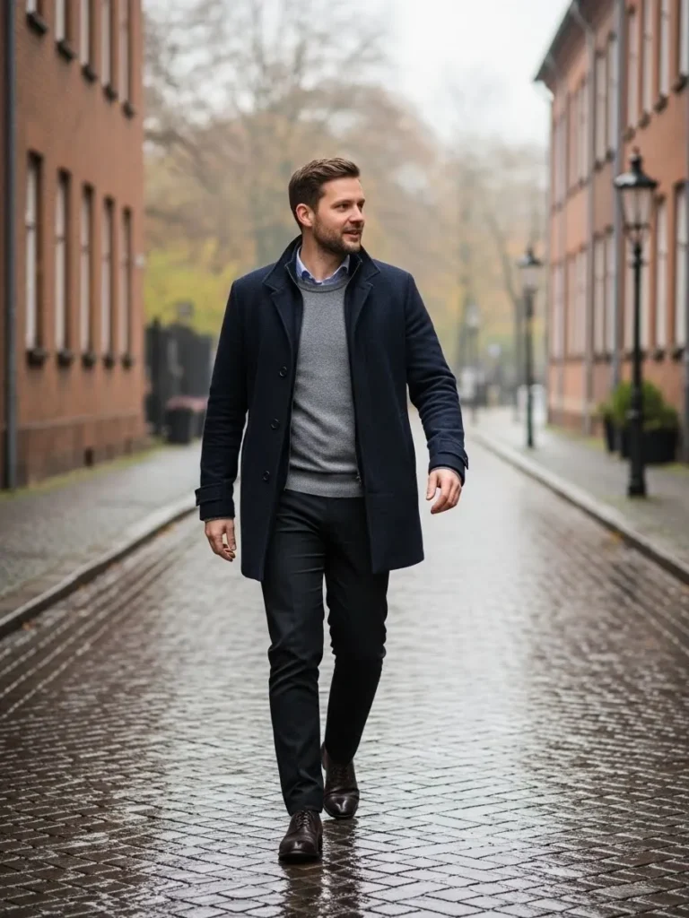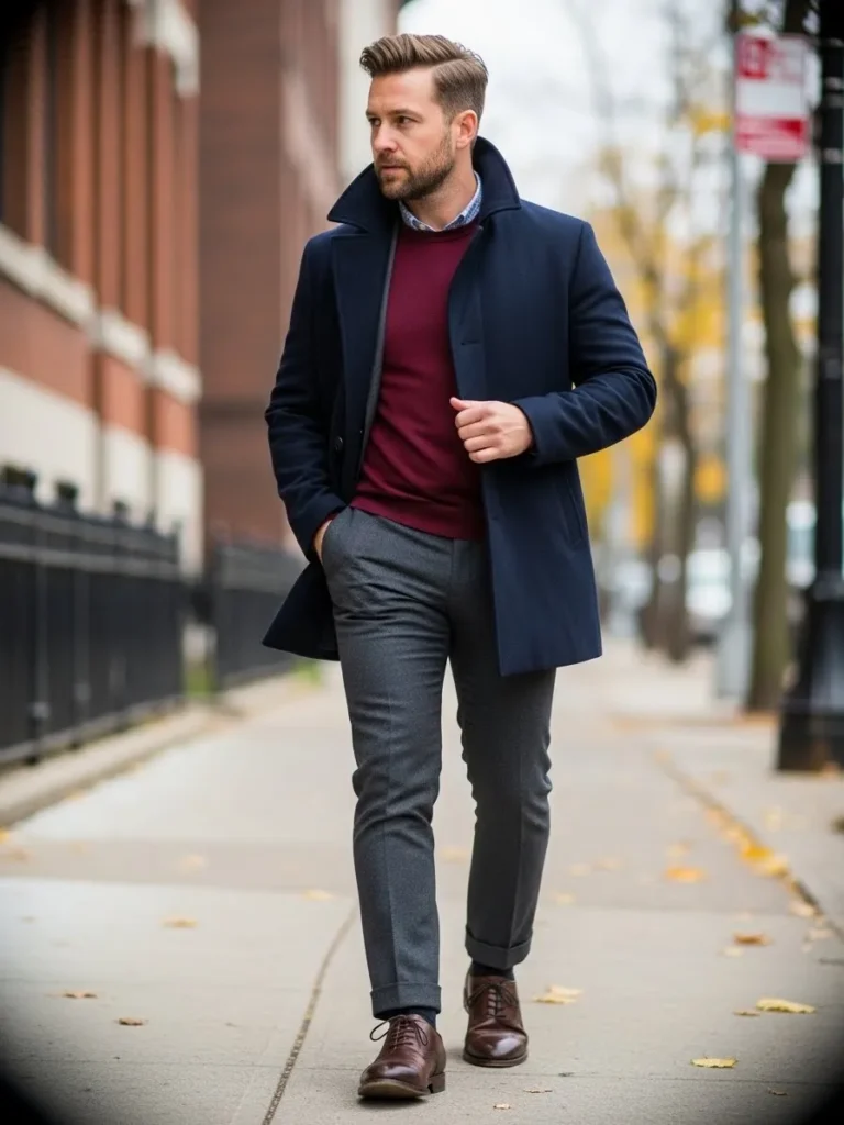 This outfit combines a deep navy coat with a burgundy knit top and tailored gray trousers. Brown leather shoes ground the look, while the fitted layers create a clean and confident silhouette that feels perfect for crisp fall days.