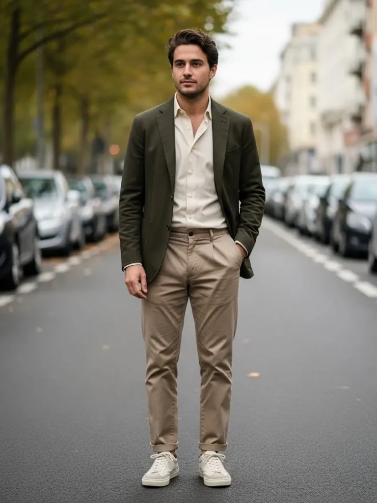 This outfit features an olive green blazer worn with a light button down shirt and beige trousers. The color mix feels warm and seasonal, while the relaxed tailoring keeps the vibe semi formal rather than strict.