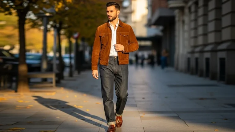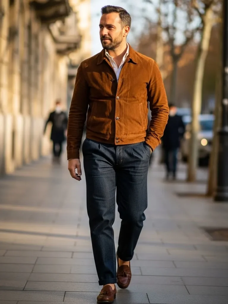 A rich brown suede jacket is styled with a simple shirt and dark trousers, giving the outfit texture and depth. The suede adds warmth and interest, while the clean lines keep everything looking polished.