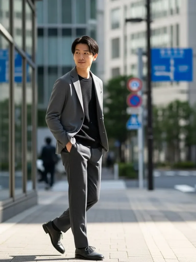 I find this combination very appealing because it feels calm and put together. The gray jacket looks sharp without feeling stiff, and the overall balance makes the outfit feel easy to wear. It has that quiet confidence that always looks good.