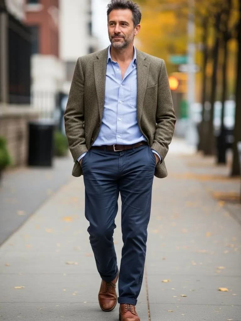 This look pairs a textured brown blazer with a light shirt and dark trousers, creating a warm and inviting autumn outfit. The fit feels relaxed but polished, making it ideal for casual meetings or evening walks.