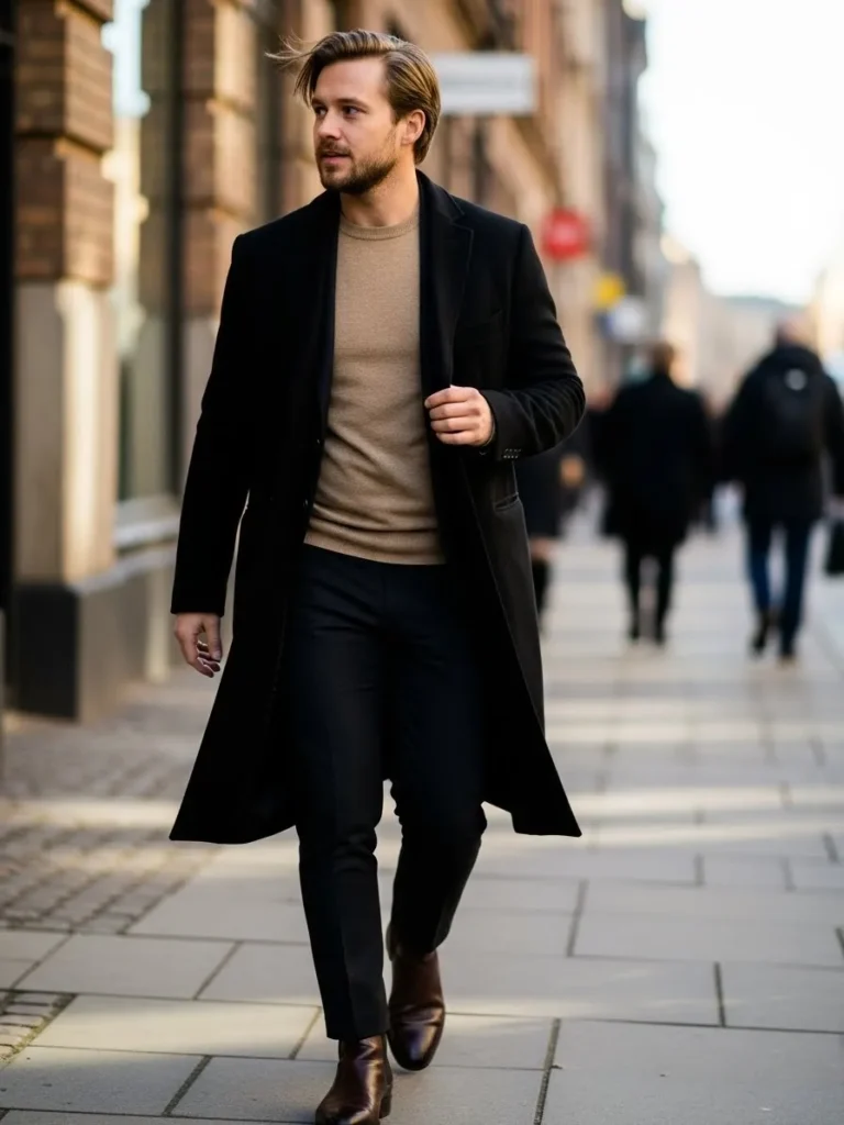 I love how dramatic but still wearable this looks. The long coat instantly adds style points, and the simple layers underneath keep it grounded. It feels modern, refined, and quietly confident, which is always a winning combination.