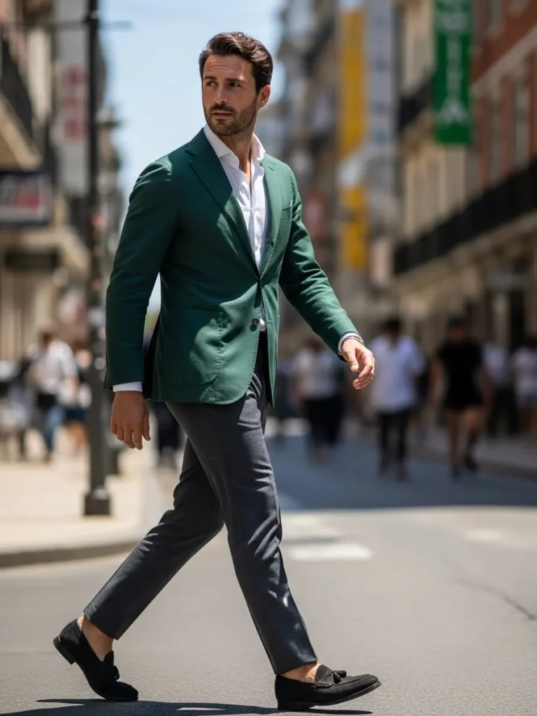 A deep green blazer is styled with a crisp shirt and tailored trousers, creating a look that feels fresh and confident. The rich color adds interest while the classic pieces keep the outfit semi formal.