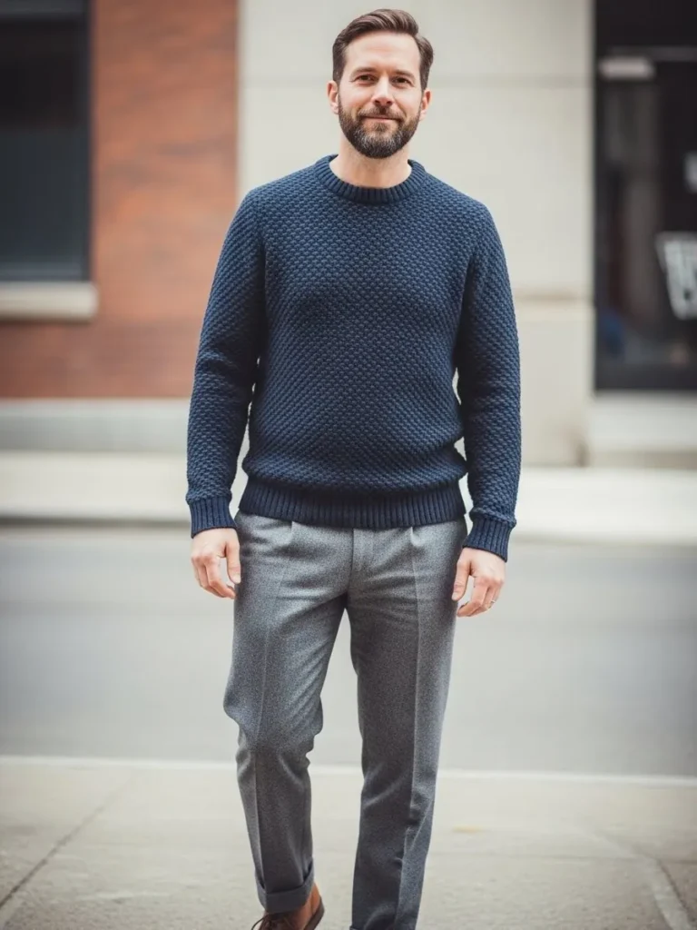 A navy textured sweater is styled with tailored gray trousers and dark leather shoes. The knit adds visual interest while the structured pants balance everything out. The overall look feels clean, masculine, and slightly elevated.