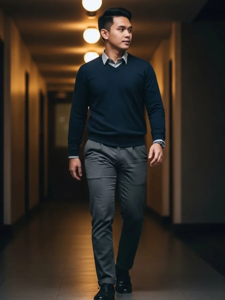 I really like how easy this one feels without slipping into boring territory. The gray sweater brightens things up while the navy pants keep it grown up. It gives that quiet confidence vibe that always feels attractive to me.