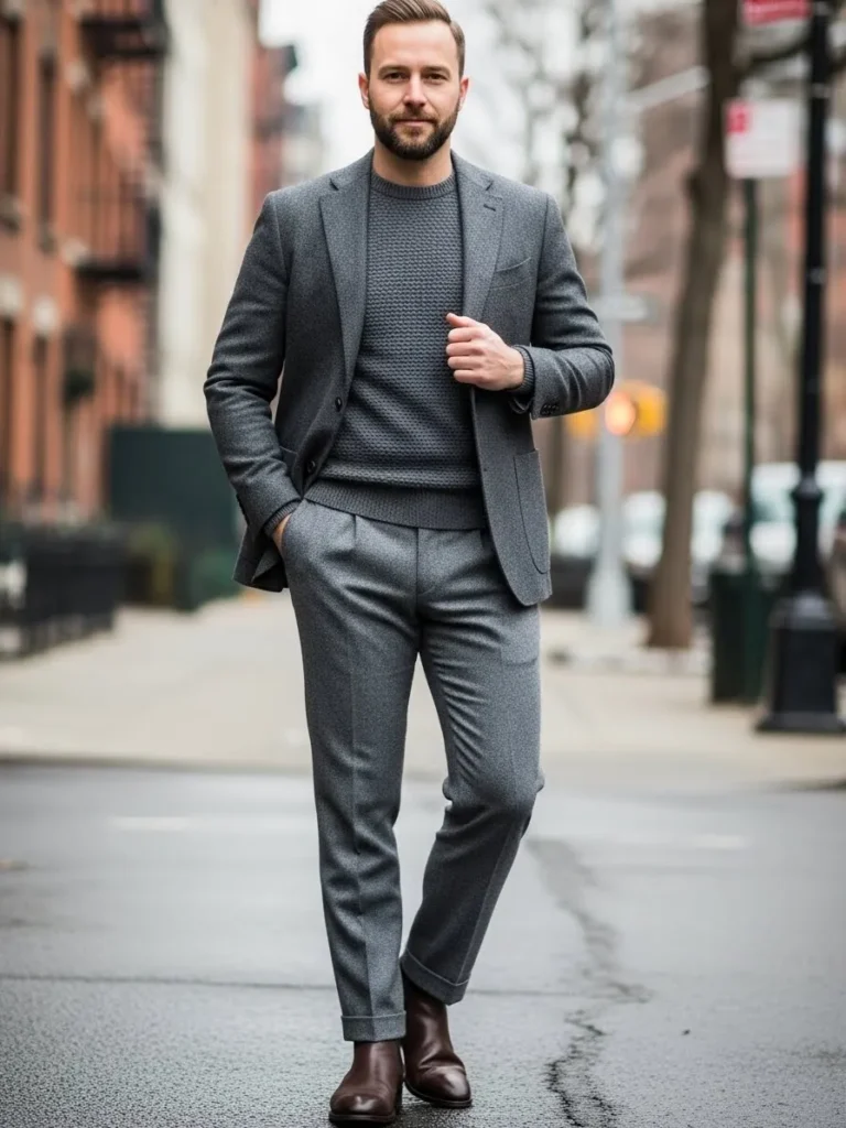 This outfit leans into darker tones with a charcoal sweater paired with tailored gray trousers and leather shoes. The textures stay subtle, letting fit and color do the work. The overall vibe is clean and confident.