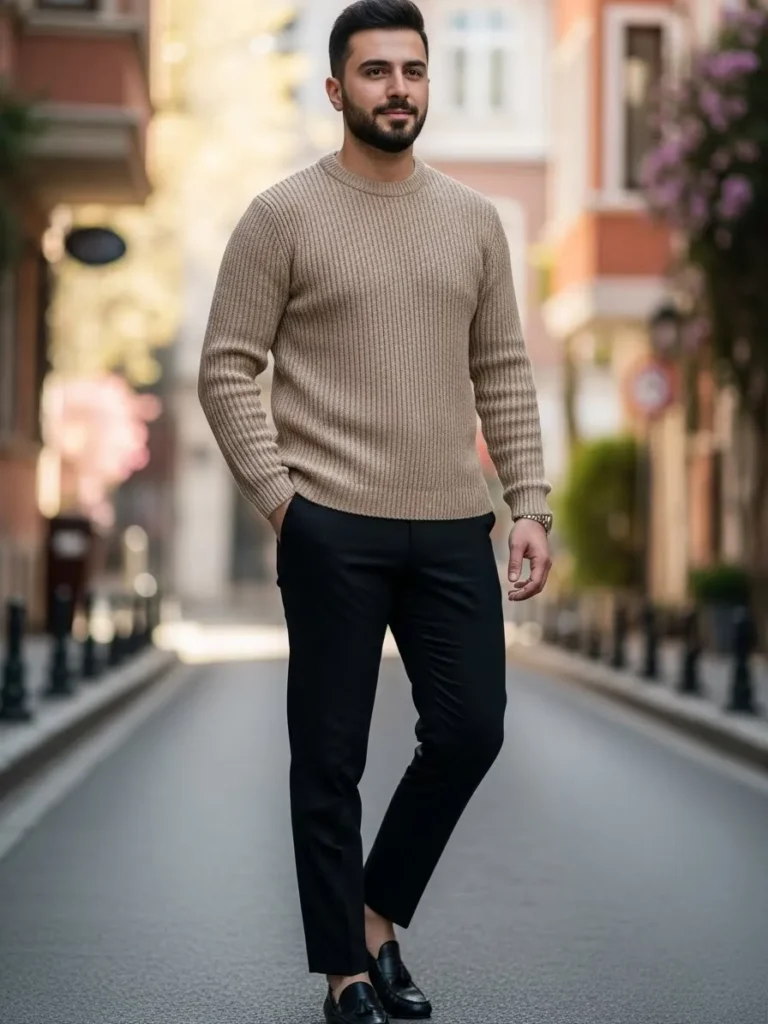 A ribbed beige sweater adds texture and warmth when paired with slim black trousers and sleek shoes. The contrast between light and dark keeps the outfit visually interesting. It feels modern and polished without trying too hard.