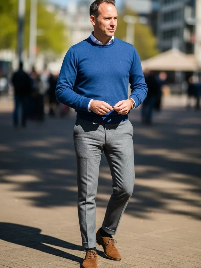 A bold blue sweater is styled with tailored gray trousers and brown leather shoes. The smooth knit keeps the color refined rather than loud. The look feels fresh, confident, and well balanced.