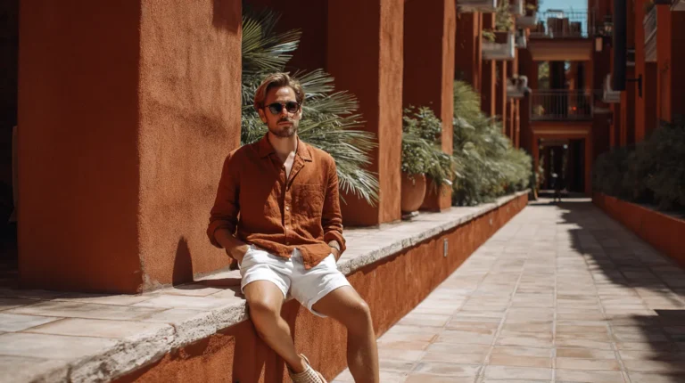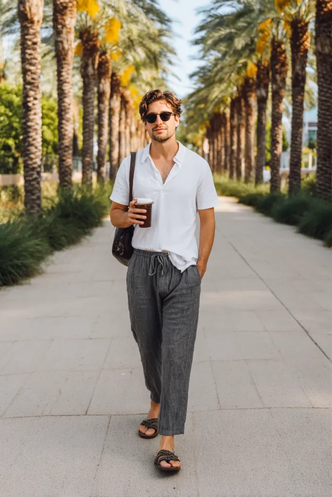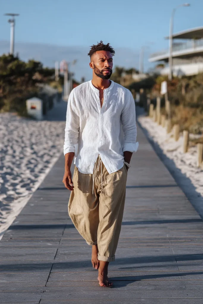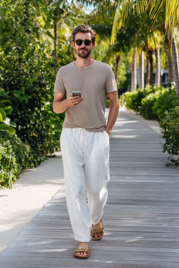 I absolutely adore this look because it showcases how simple, high-quality fabrics and a great fit can make such a refined statement. The monochromatic, neutral palette is so chic and allows the textures of the linen to really shine. The loose, flowy fit of the pants is super comfortable yet still looks incredibly stylish and flattering. It’s the perfect blend of laid-back vacation style with a touch of sophisticated class that I think looks amazing on any guy.