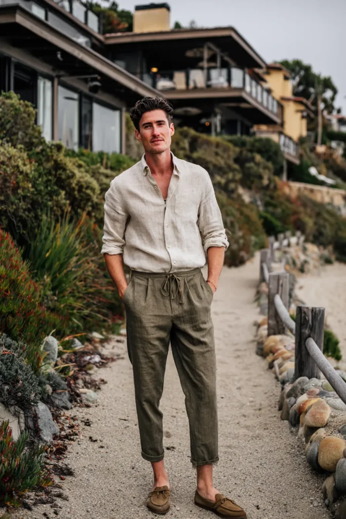 This outfit is the pinnacle of comfortable sophistication for a slightly moody beach day or early evening stroll. He’s wearing a long-sleeved linen shirt in a pale oatmeal or sandy beige color, tucked into a pair of relaxed-fit linen trousers in a deep, earthy olive green, featuring a drawstring waist. The pants are casually cuffed just above the ankle. The look is grounded with light brown suede loafers, giving it a polished, yet totally relaxed, resort feel.