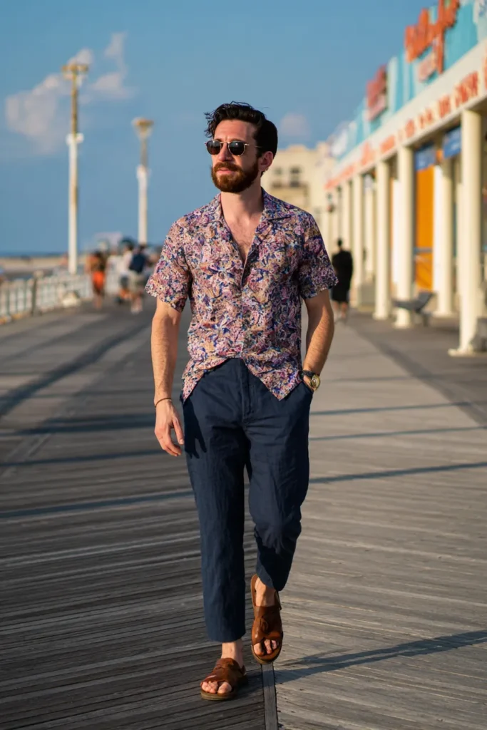 This outfit is such a refreshing way to wear a bold print while still looking incredibly polished and refined. He’s rocking a short-sleeved button-up shirt in a colorful floral or paisley pattern with a relaxed Cuban collar, featuring shades of purple, pink, and green. This lively top is perfectly grounded by tailored navy blue linen trousers that are cropped just above the ankle. Simple brown leather sandals and a classic wristwatch complete this stylish boardwalk look.