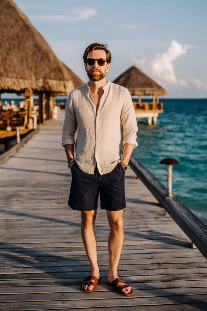 This is the ultimate luxurious resort look, perfectly styled for watching a sunset over the water. He’s wearing a long-sleeved linen shirt in a beautiful pale beige or natural oatmeal color, featuring a stylish band collar, with the sleeves effortlessly rolled up. This light top is beautifully contrasted with structured, deep navy blue tailored shorts that hit mid-thigh. Simple brown leather slide sandals, a sophisticated watch, and classic aviator sunglasses complete this high-end, relaxed ensemble.