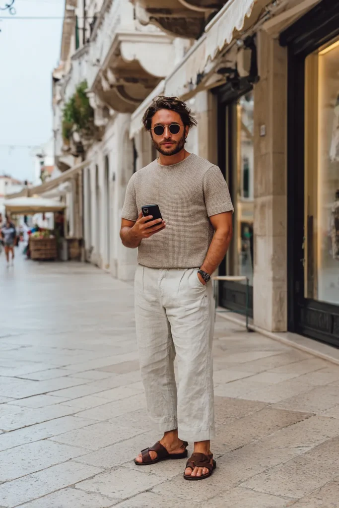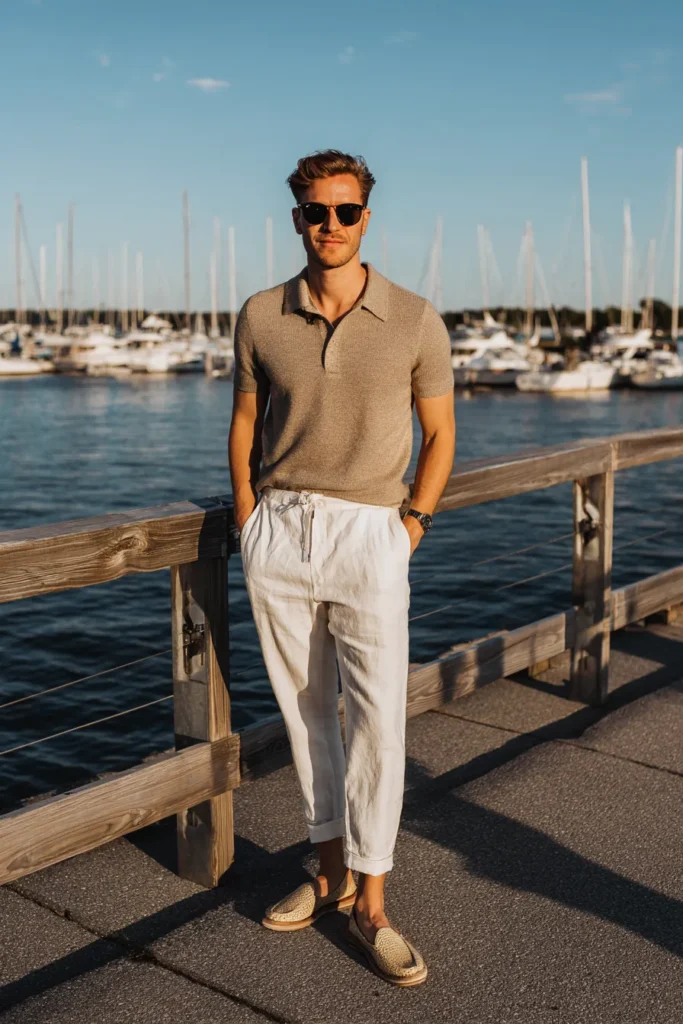 This look is absolutely perfect for a relaxed afternoon by the water, exuding that effortless European summer vibe. He’s wearing a fitted, short-sleeved knitted polo in a warm taupe or mushroom brown color, which looks so sophisticated. This top is paired with crisp white linen trousers that have a drawstring waist and are casually cuffed above the ankle. Light-colored woven espadrilles, stylish sunglasses, and a watch complete this chic marina ensemble.