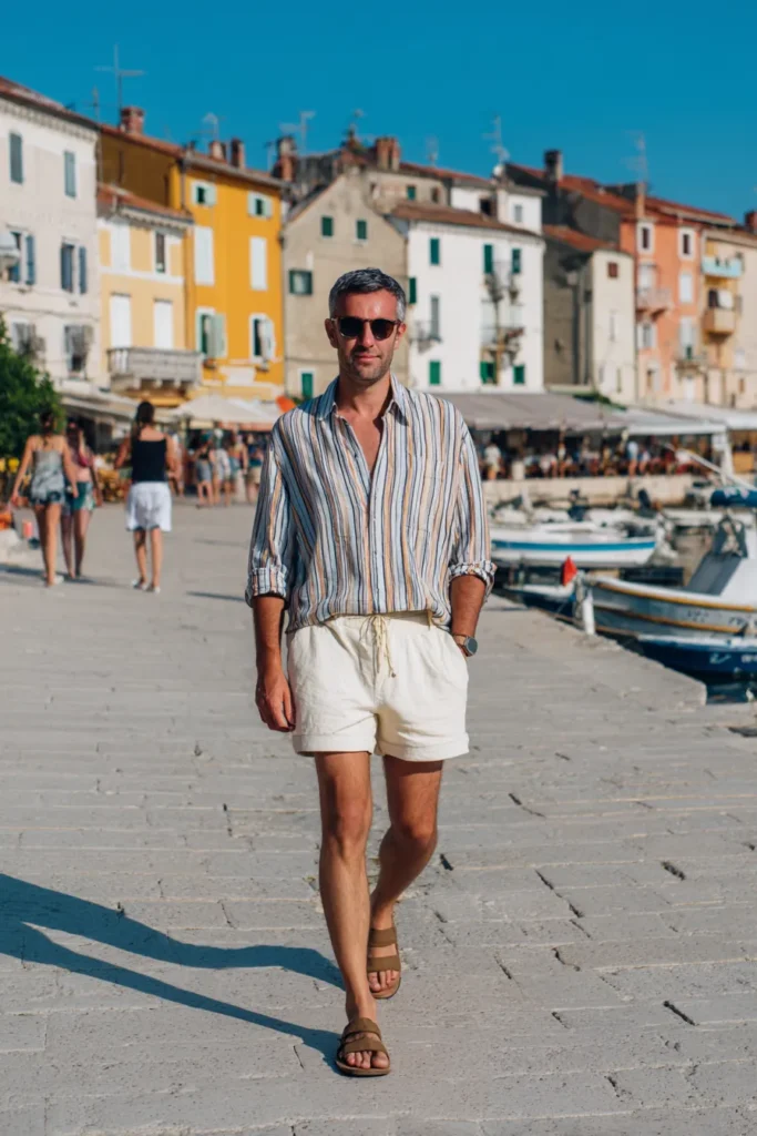 This look screams European coastal holiday and feels so incredibly relaxed yet classy, especially with those beautiful colorful buildings in the background. He is wearing a long-sleeved button-up shirt in a light linen or cotton blend, featuring vertical stripes in muted shades of blue, yellow, and beige, with the sleeves rolled up casually. The shirt is slightly tucked into off-white or cream drawstring shorts that have a comfortable, relaxed fit. Simple brown leather sandals and cool sunglasses complete this effortlessly chic pier-side outfit.