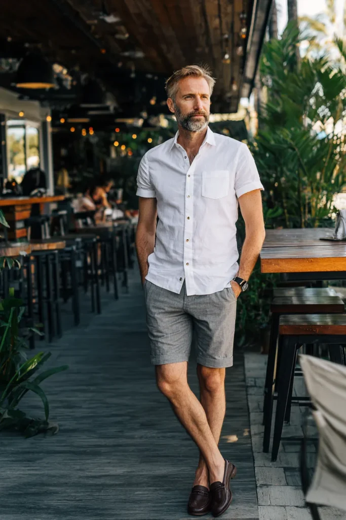 This is a fantastic example of balancing bright summer light with sophisticated structure for a warm evening in a tropical setting. He’s wearing a crisp white short-sleeved linen shirt, perfectly ironed but still breathable, with the sleeves neatly rolled up for a relaxed touch. This is paired with tailored shorts in a gorgeous medium grey or salt-and-pepper shade, giving a nice contrast to the bright white top. Dark brown leather loafers and a sleek watch dress up this shorts outfit beautifully.