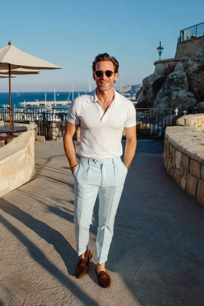 This look is absolutely giving off major Italian coastal vibes and feels so fresh and upscale for a daytime vacation outfit. He’s wearing a super clean, fitted white short-sleeve polo shirt that looks sleek and flattering. This is paired with stunning light blue or pastel sky-blue linen trousers that have a refined pleat and are neatly cuffed at the ankle. Dark brown leather loafers, sophisticated round sunglasses, and a classic watch complete this perfectly polished resort ensemble.