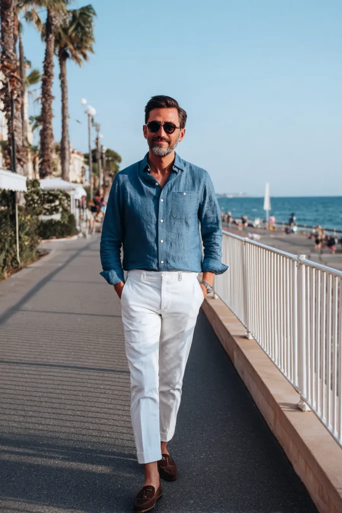 I think this combination is a winner because it’s a timeless classic that always works in a sunny climate. The contrast between the saturated blue on top and the clean white pants is so striking and instantly elevates the entire appearance. Plus, choosing breathable fabrics like linen keeps the wearer comfortable while still looking polished and refined. It’s the perfect example of dressing up for vacation without sacrificing that relaxed feeling.