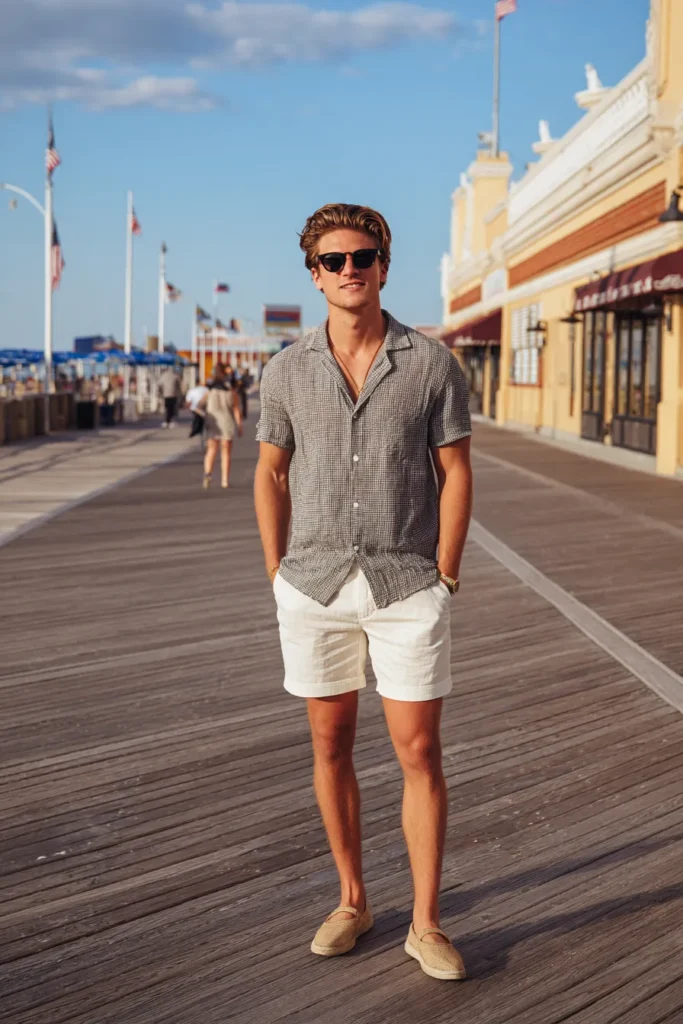 This look is absolutely perfect for a sunny day on the boardwalk or exploring a cute beach town! He’s sporting a fantastic short-sleeved button-up shirt with a cool, subtle check or gingham pattern in shades of grey and white, giving it a really fresh and airy feel. This is paired with crisp white shorts that hit above the knee, creating a clean and sharp contrast. Light-colored espadrilles, stylish sunglasses, and a simple chain necklace complete this effortlessly cool ensemble.