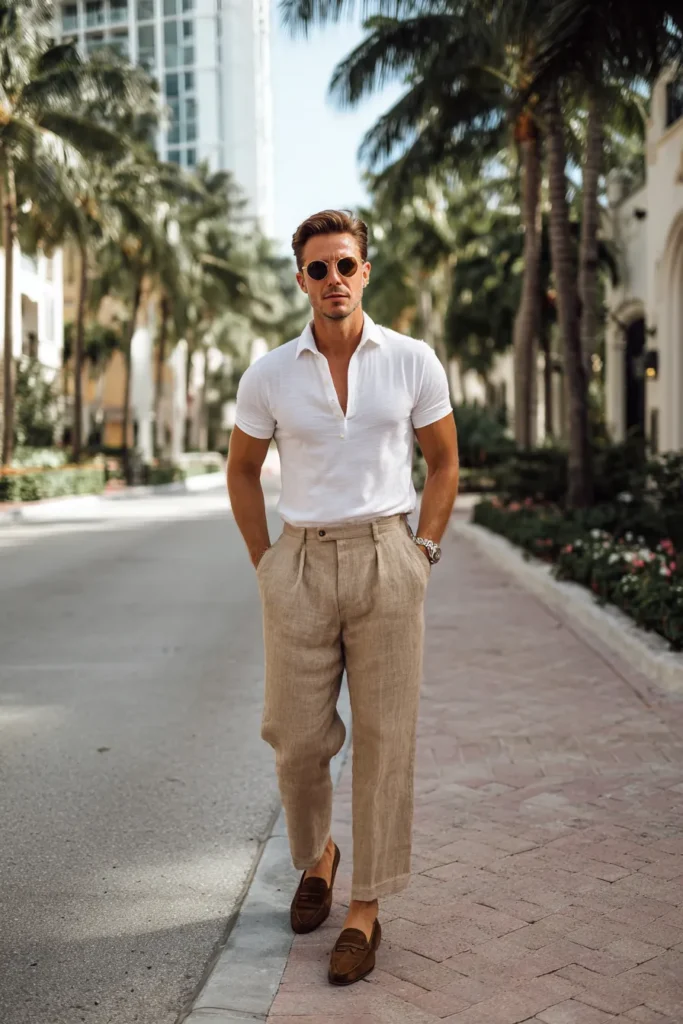 This outfit is the picture of tropical tailoring, mixing classic pieces with resort-ready fabrics. He’s wearing a fitted, short-sleeved white knit polo shirt, often called a knitted or Cuban polo, with a stylishly deep open V-neck. This is paired with stunning high-waisted, wide-leg linen trousers in a beautiful natural khaki or oatmeal color, which are perfectly pleated and slightly cropped. Dark brown suede loafers, a sophisticated wristwatch, and round, tinted sunglasses complete this luxurious look.