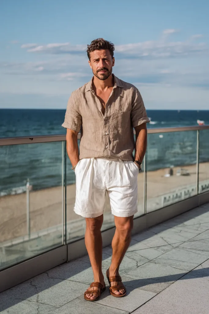 This look is the ultimate vacation uniform, combining earthy tones with light, airy comfort by the sea. He’s wearing a short-sleeved linen shirt in a gorgeous, muted taupe or light brown color, left casually unbuttoned at the top for that relaxed holiday feel. Below, he has on voluminous, pleated white linen shorts that offer a fantastic contrast and excellent breathability. The outfit is grounded with simple, classic brown leather sandals, keeping the whole vibe sophisticated yet totally easygoing.